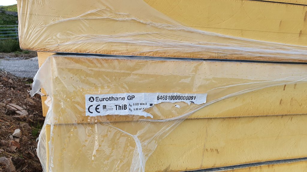 Apart from the concrete slab itself, this ‘rigid PIR foam board’ thermal insulation on the face of it is the most apparently ‘evil’ in environmental terms of all the products in our build – being some sort of high density foam product made from polyurethane. It justifies inclusion though due to two key factors: