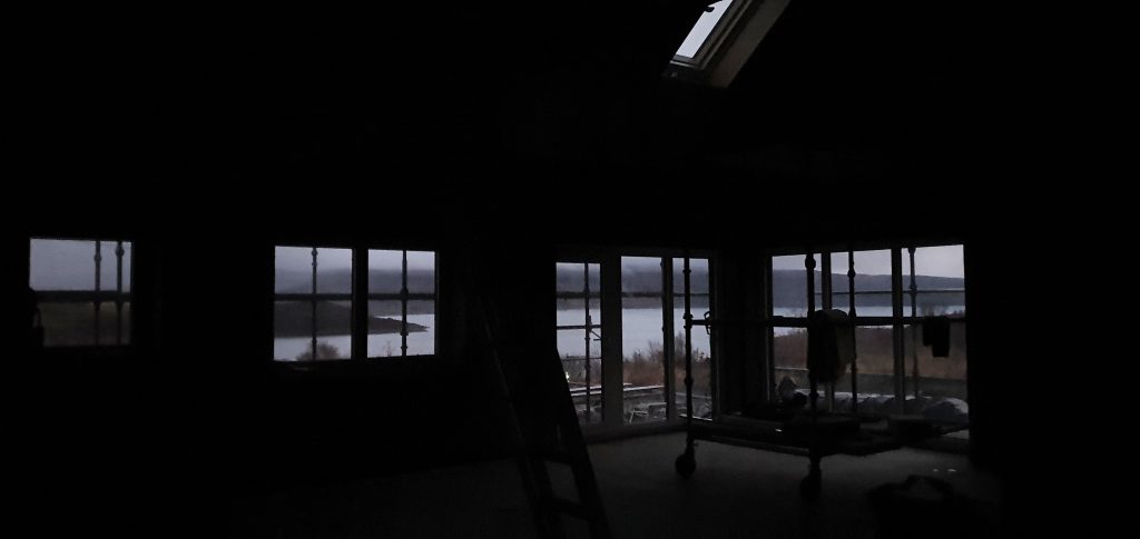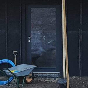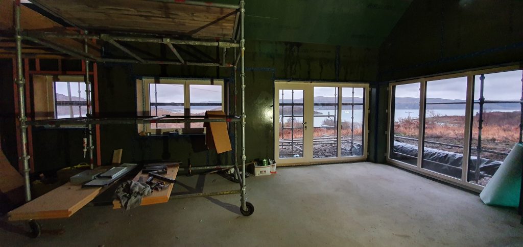 Unfortunately I wasn’t on site when the windows were put in – the one major step in the build that I missed. They were apparently extremely heavy! Now they are in, I can confirm I was fine to trust that they would be OK. Phew. Both the windows and in particular the doors have a very satisfying solidity to them. The view through them all is pretty good too…