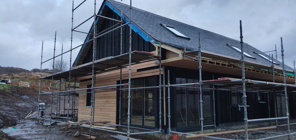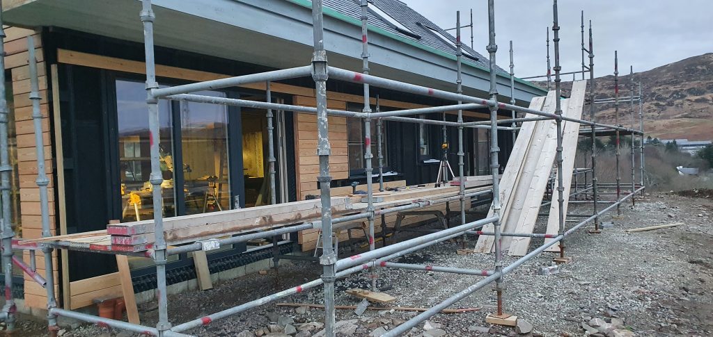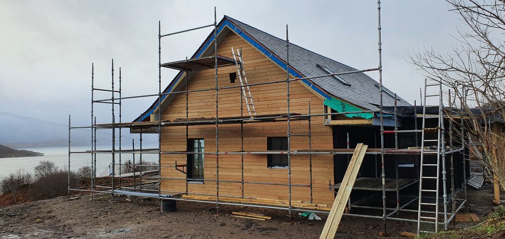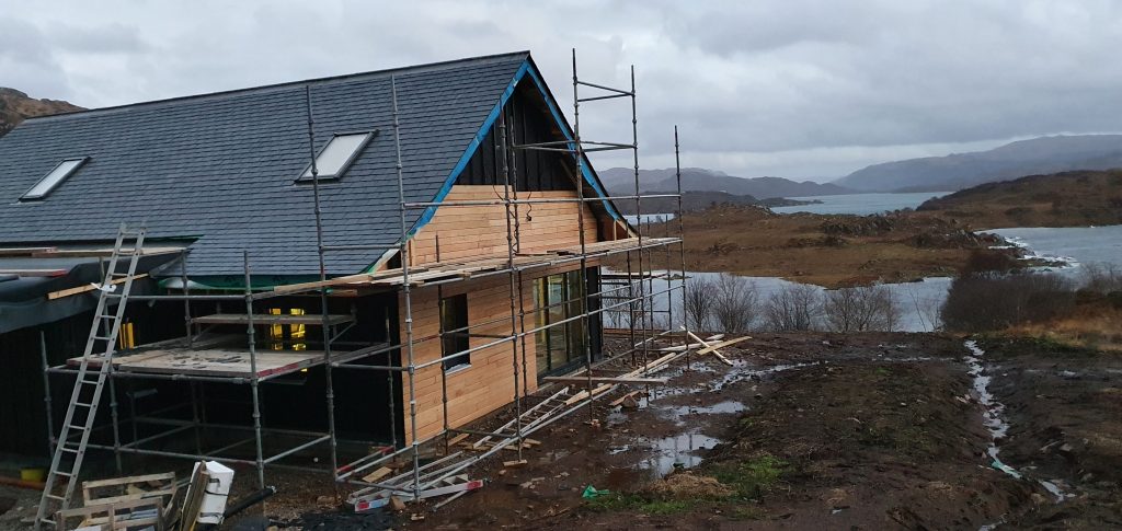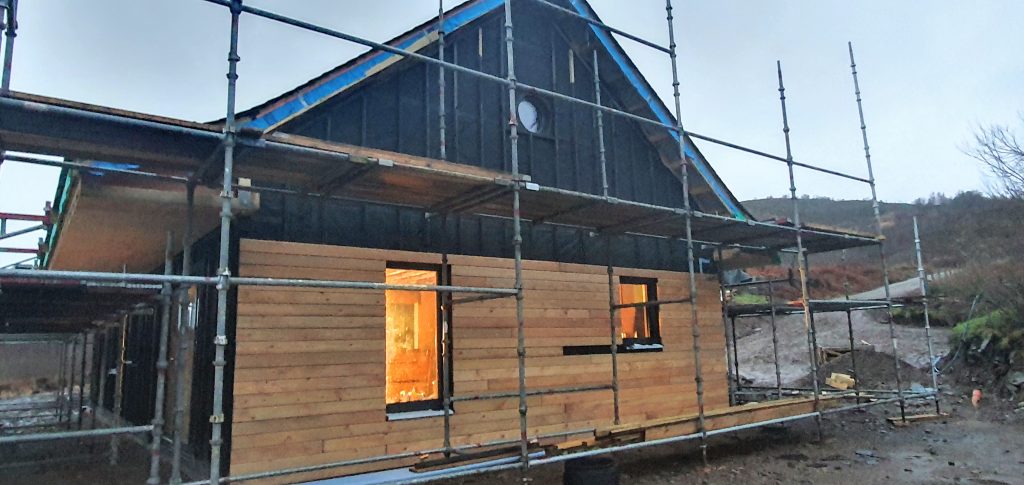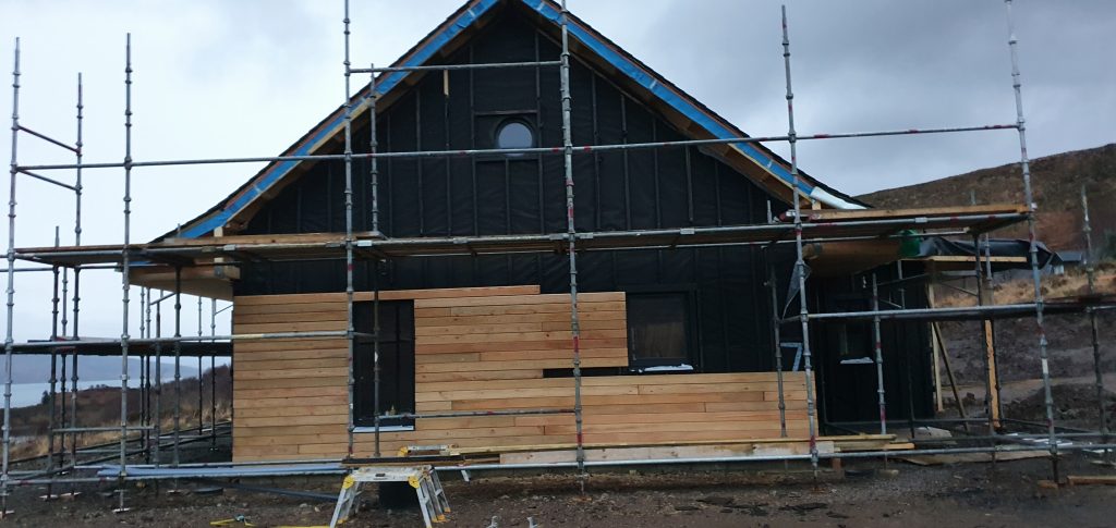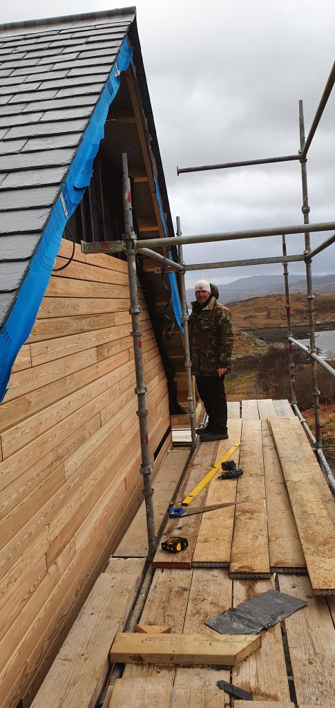 Once I started on the South (loch-facing) side on the last couple of days, doing straight cuts and not having to go up the scaffolding each time made for very swift progress. Small incremental adjustments we’d made in the process along the way also added up to major improvement in how everything worked. And even learning to use the jigsaw to cut out notches on some boards was actually pretty straightforward. Didn’t quite trust myself to cut out the circle for the window – have asked the carpenter with 40 years of experience if he would do that for me!