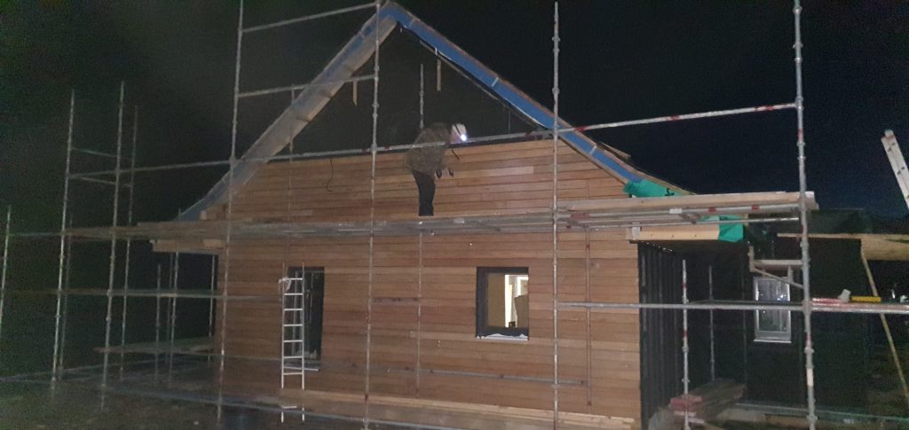 What better way could there be to disconnect from work for a week between Christmas and New Year than be up a ladder or on scaffolding in all weathers, installing larch rainscreen cladding on our house gables? I think Steve was convinced…
