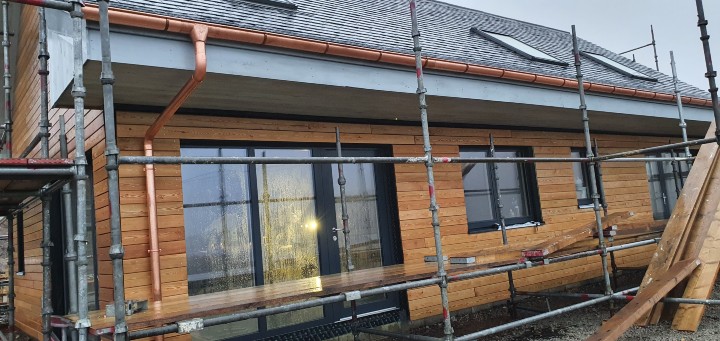 The next part of ‘decoration’ was the gutters. I’d first come across copper gutters on the COP26 House. Initially I thought they would be way out of reach financially, but having read up a bit about different gutter materials, copper scored really well from a longevity point of view, especially in our location with sea air. At the end of their guttering life, copper gutters are also fully recyclable, and in absolute cost terms, the premium in price over the original alu-zinc product that had been specified wasn’t that much. Slightly less satisfactory from a measurable sustainability impact point of view is that the manufacturers can’t tell you the proportion of their raw material that is recycled vs freshly mined copper – one manufacturer stated that it could be anything from 50-95%, and the other manufacturer just didn’t have any idea. (And yes, I am following up with them both to press them a bit on the importance of having this information, to measure scope 3 emissions!). We are very happy with how they look though, both in their fresh shiny state and as they begin to age through to that lovely green colour.