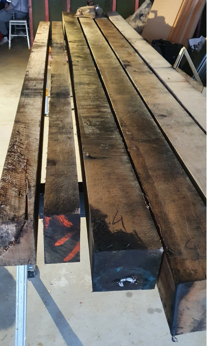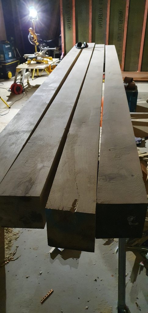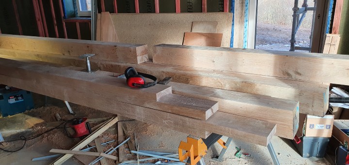 Then to the oak posts. And another big lesson for me. I was asked the question: would we like off-saw or dressed oak for the porch posts. I did check with Peter, and we both agreed as these were going to be outside, subject to weather, we didn’t need an ultra smooth finish and any dressed oak would likely look like off-saw within a year anyway. I guess the answer though is it depends where the off-saw posts come from, and where they were stored once they were sawn! Below is a picture of the posts when they arrived: let’s just say they were a lot rougher looking than everyone expected. Plus they arrived in very random lengths, not totally straight and therefore needing a lot of attention from Michael to make them look good. He really did transform them though.