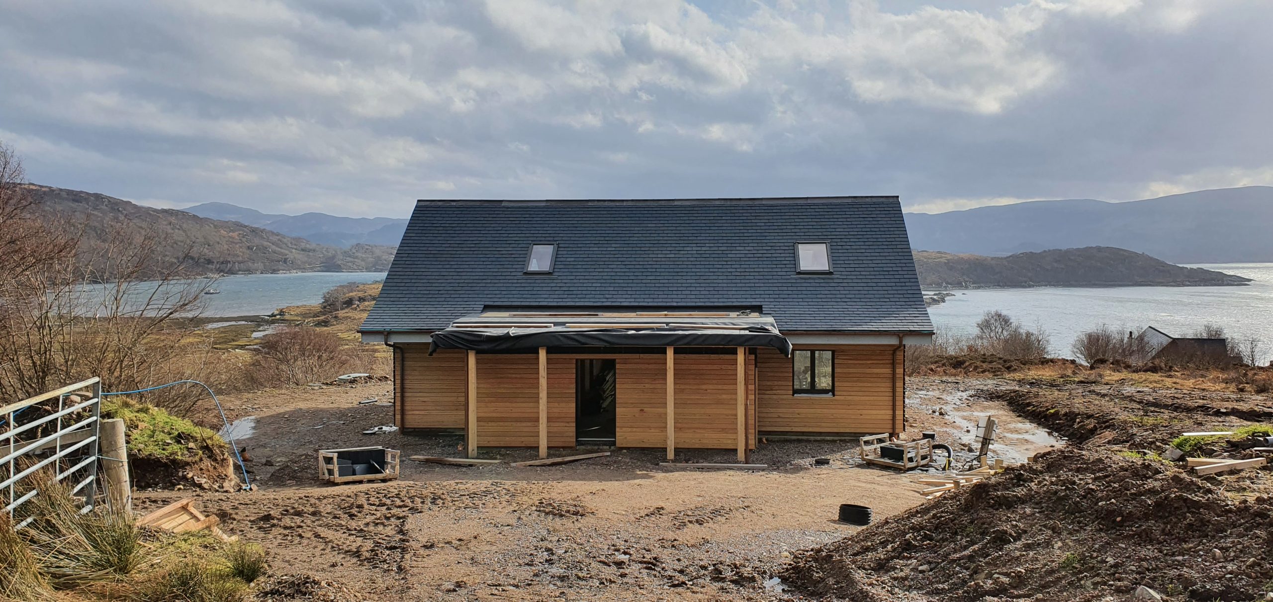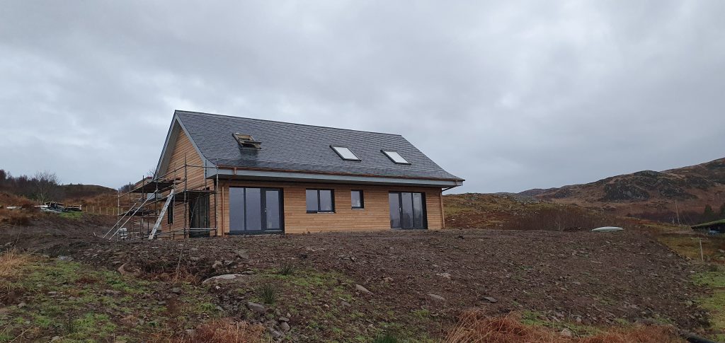 So we’re waiting for two consecutive days when the flat roof covering and fascia boards on the flat roof section can be finished. And then it’s installation of blown-in insulation before we have our first airtightness test. But before that, the house had a month of total quiet during February – and given the weather that Ardnamurchan had during that month, we timed it well!