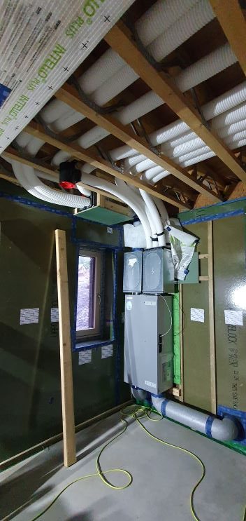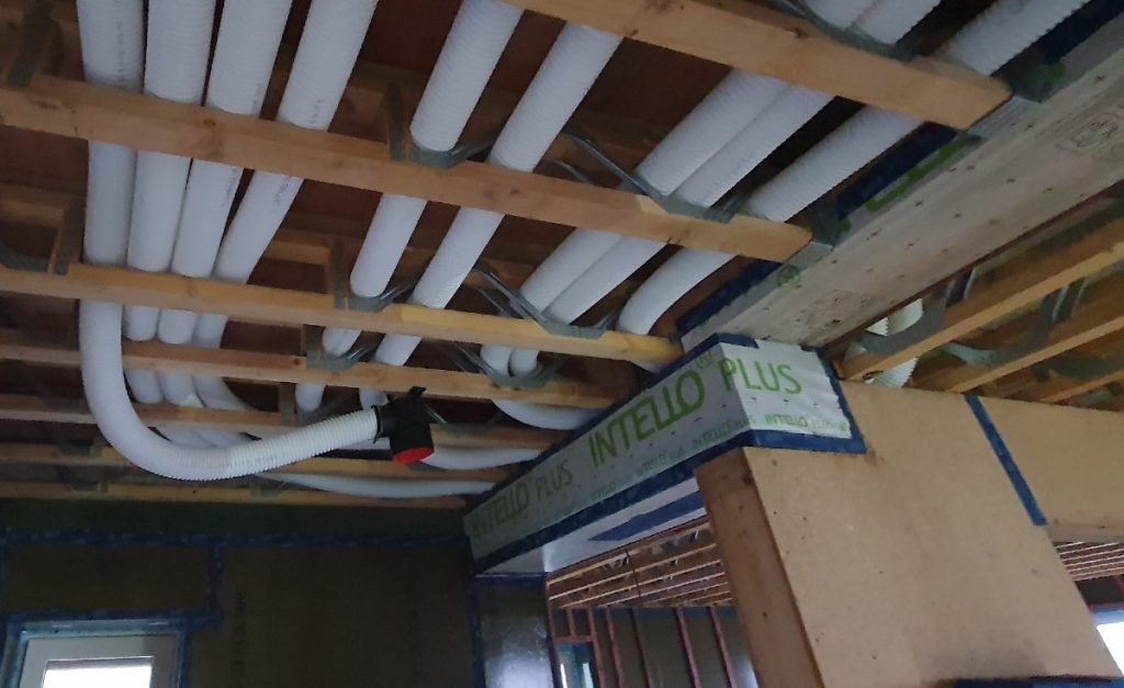 Then on to the semi rigid ducts. There is at least one duct in every room either extracting air – in the case of, for example, bathrooms and kitchen – or inputting fresh air – in the case of the living spaces and the bedrooms. With lots of nice joists to feed the ducts through, the majority of the task wasn’t too difficult. Unfortunately, however, because of the connection between the flat roof section of the house and the main eaves section, it wasn’t quite so straightforward. In the flat roof part the ducts are outside the airtight layer and therefore they have to feed through into the airtight main house section without leaking any air. One of those jobs that definitely would have been easier with a couple of people, but with only me on hand, it just took quite a long time (pretty much 2 days for 10 ducts) to tug them through.