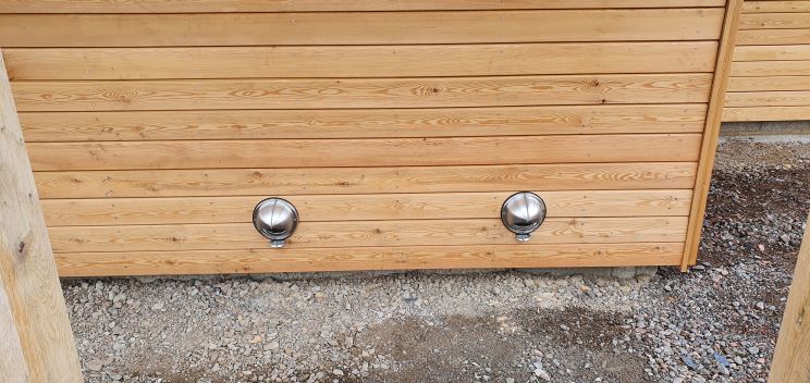 After a whole load of measuring, calculating, forgetting what I’d measured, checking instructions again, and generally wasting several hours (perhaps days) of my life, I really did have to make those holes in the wall. After drawing on the inside wall where I thought the ducts should go, checking that this made sense with the larch cladding boards on the outside, it was time to drill right through from inside to outside using the fairly massive 600mm x 10mm augur drill bit we’d bought for the purpose. The challenge was keeping the drill bit level and parallel to the i-joists as it went through the 400mm air gap between the interior Durelis board and the outer 80mm layer of Pavatex/woodfibre. Seemed to work ok, so then on to the 170mm hole cutter – first on the inside, and then outside cutting through the Pavatex (I decided I wasn’t quite brave enough to cut the larch as well at this point – save that excitement for another day). So once the hole was there, I had to to simply feed a tube made of polystyrene through from inside to outside – the ‘insulated duct’. The first duct worked like a dream! The second one… clearly I was slightly overconfident, and not careful enough about the level and parallel augur bit. It all worked in the end, and we now have two large openings through the front wall of the house.