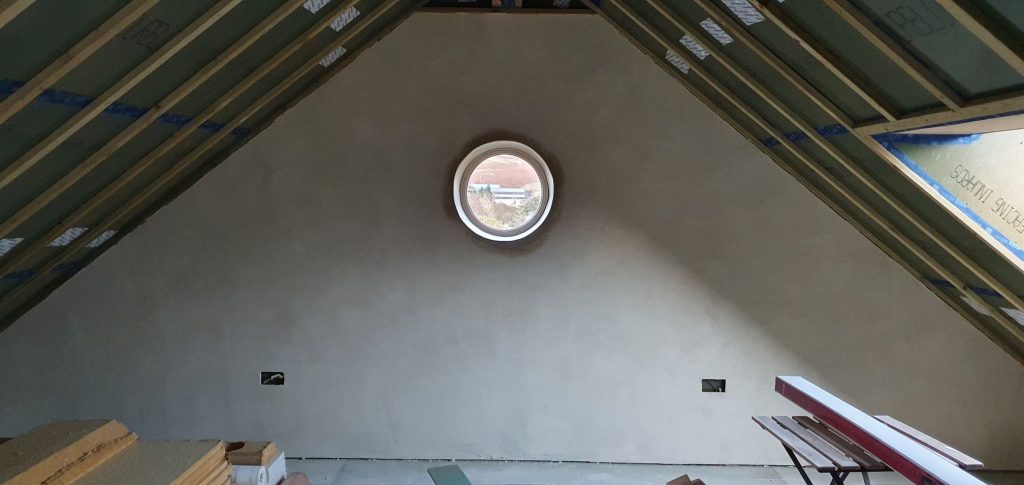 These time-lapse videos are quite fun showing plastering of the west gable wall. (And would have been even better if I hadn’t managed to nudge Gemma’s phone early on in the initial coat…)