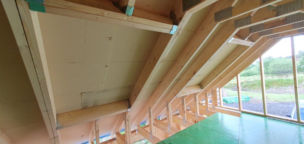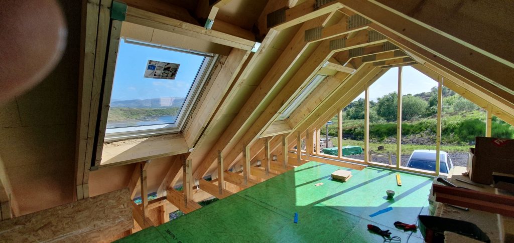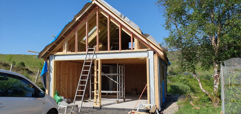 Once the main structure of the garage was up, the focus was on getting it to the stage that the roofer could come and slate. Fortunately at the end of the week, the weather switched to dry and sunny – and whilst on a few days midges were fairly abundant at the beginning and end of the day, guess can’t have everything!