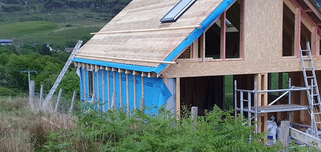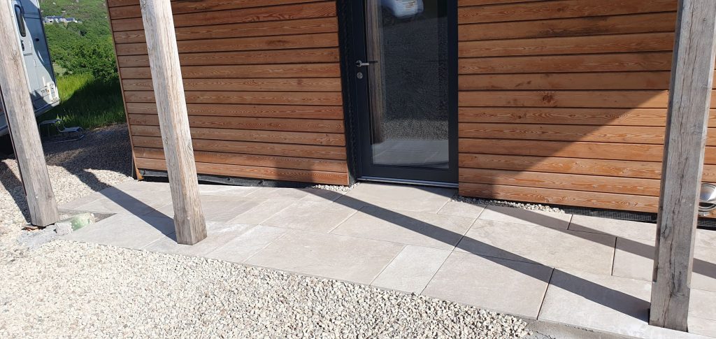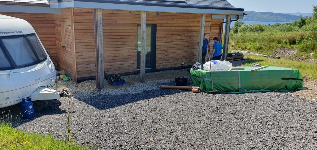 This week also happened to be the week that we had booked in Henry from Ardnamurchan Landscaping to make a start on the paving at the front of the house. Again one of those jobs that on the face of it you’d think would be straightforward – make the ground basically level, and chuck a few paving stones down? Unfortunately not. Sorting levels and accessibility regulations definitely make things slightly more complicated. For accessibility, you need to have a relatively flat and flush threshold with the front door – with at least 1m2 flat area in front of the door and then a slope down from there as required. As a regular reader of Melanie Reid’s column in The Times, I definitely understand more than ever how critical these seemingly inconsequential areas of a building are. That said, having a step up to the front door would have been a whole lot easier!