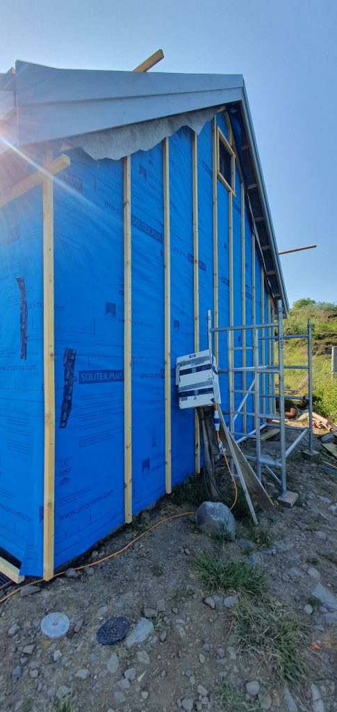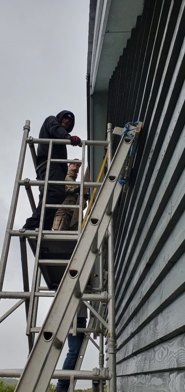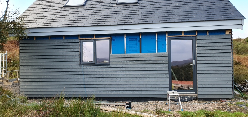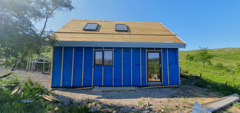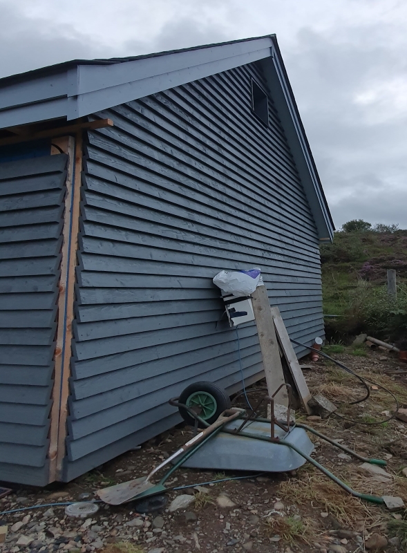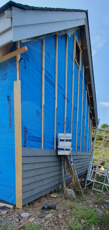It was quite satisfying seeing more of the bright blue membrane being covered up each day. Steve’s son, James, joined us for the first week and having two or three of us working together made for fairly speedy work. Steve’s friend Stuart then joined us for the last week in August, and together he and Steve valiantly worked through a couple of days of midge hell to get the east gable completed. My brother also kindly helped on the final afternoon of east gable cladding. Another tricky thing ticked off.