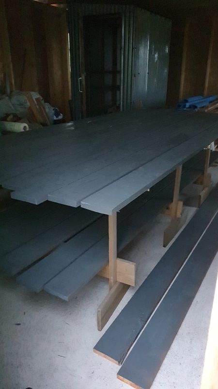 Painting the boards was a bit of a monster job. The weather generally wasn’t reliable enough for me to be able to paint the boards outside (before they were fixed to the wall), so it tended to be an end-of-day job, getting 15 boards painted (the maximum there was room for laid out in the garage on trestles) ready for the next day. We also had lots of discussion about whether to paint the back as well as the front of the boards… the pros of doing both sides: greater protection and the boards wouldn’t warp so much in one direction. The cons: huge amount of paint and painting time, especially as needed 2 coats. Pragmatism won, and most of the garage boards aren’t painted on the back non-visible side. The exception is the west gable, which gets most of the weather, that decided I would paint both sides. Will be interesting to see the difference over time. As they are 25mm thick boards, hopefully the warping issue should be minimal – let’s see!