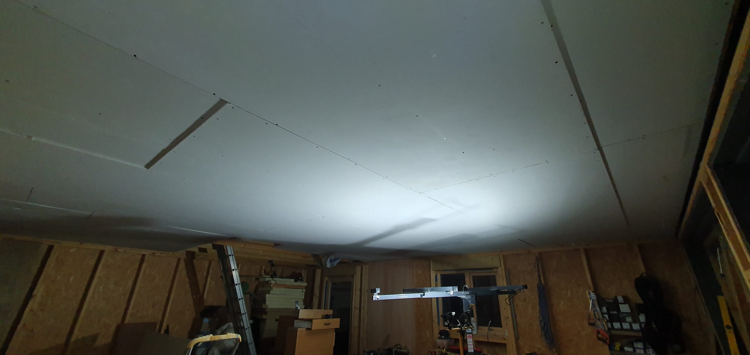 Finally everything was prepped so we could do the plaster-boarding itself. Didn’t take us long to remember that we really are the slowest plaster-boarders in the world! It wasn’t helped by the fact that the garage is fairly rammed full of stuff, so every time we moved to a different part of the ceiling we had to moved things around so that we could get the lifter in place. One of the motivations for doing the plaster-boarding at this time was to free up the significant floor space that the pile of stacked boards took up in the corner of the garage – whilst there are still a lot of things to do before get to constructing the internal stud wall, with the boards stacked up, this would be impossible.