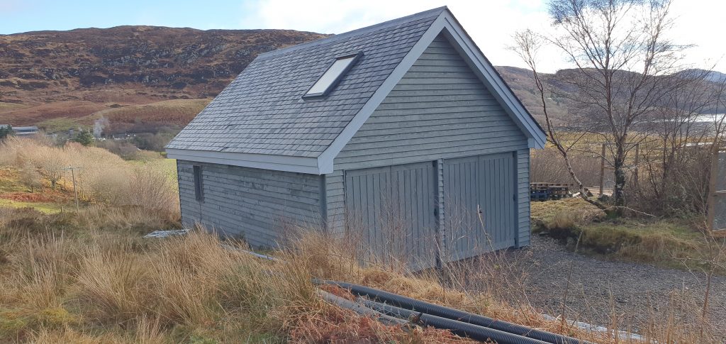 This has been a bit of a slow burn, given we started it in August (or perhaps even July). But finally this trip up (23rd February) the last cladding board went on to the north side of the garage (the top image is when the final board was put up – it’s a rule that always should be totally dark when you finish these things). A few parts still need a second coat of paint once the weather warms up, but great to get it done. I got pretty efficient towards the end…. Still need to get the guttering on, but moving on with inside has priority for now.