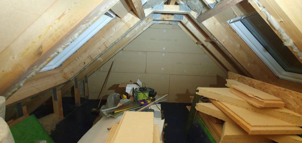The main garage space was fairly rammed with stuff, but the upstairs room had also been used for the past few months as useful storage for all sorts of things. Not least, we’d put the 2 fairly substantial stacks of Scots pine floor boards up there, the 20+ large bales of cosy wool insulation, a couple of piles of leftover Steico fibre boards that were going to be used for additional insulation on the West gable, some additional very heavy blue boards (conveniently located underneath the stacks of floor boards…), plus all the green Smartply propassiv boards that would be used to board out the sloped roof section. Like every building task, the first step was to move and re-stack a whole load of materials (and then move them somewhere else again approximately every half an hour on a repeat pattern….)