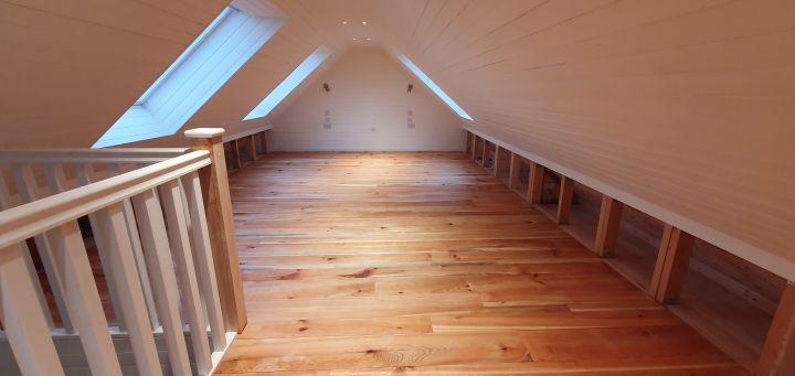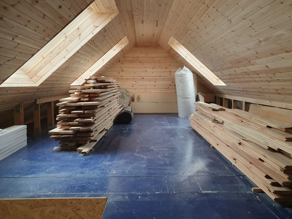 Once I’d done the main part of the room, we had enough wood left to do what will be cupboards and shelves in the sides of the room – so more fun (including back ache and multiple scrapes and bumps on head) in those triangular spaces!