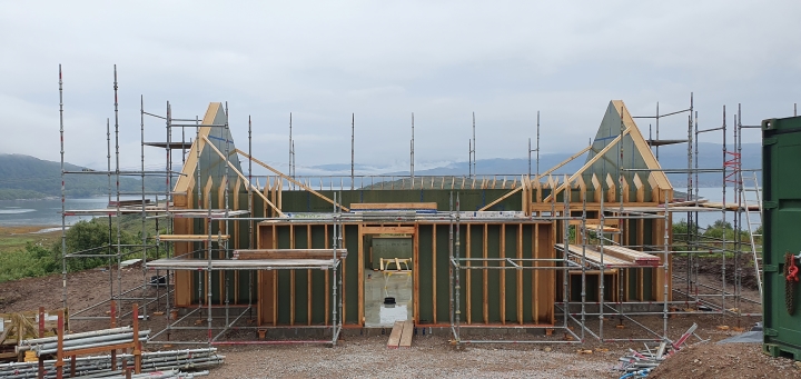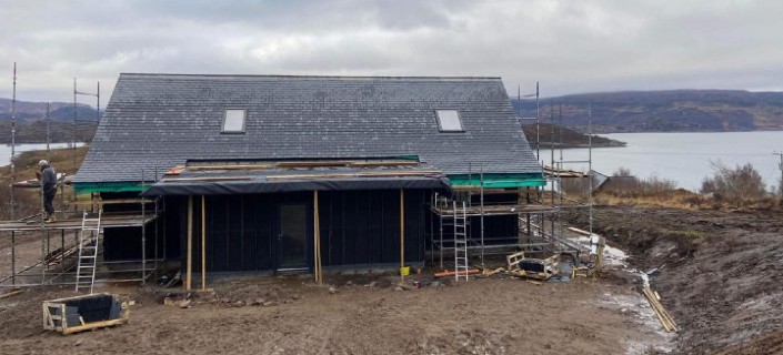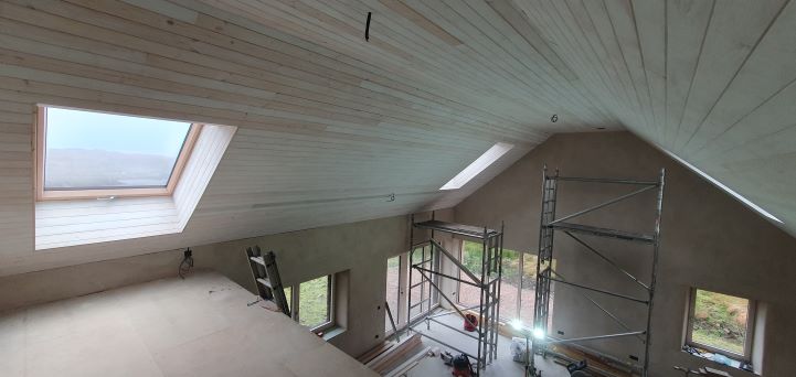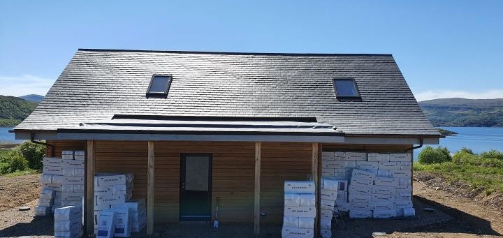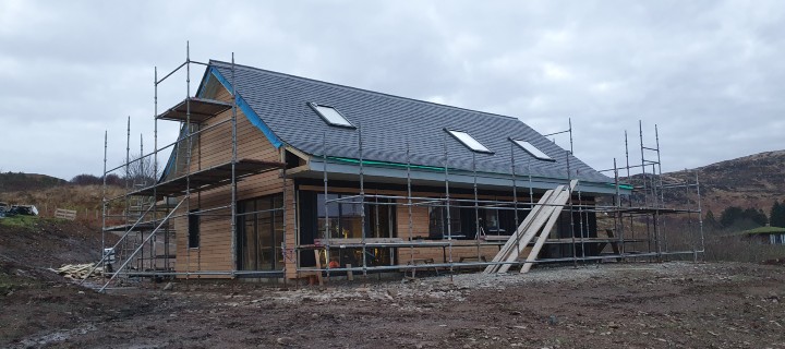Lots of layers to the roof: first the roof rafters: then the same 80mm woodfibre that covered the walls, providing insulation: then the membrane covered the whole thing, including – temporarily – the roof light openings, and the battens: Next came the sarking, which is a pretty major difference between constructing a Scottish and an…